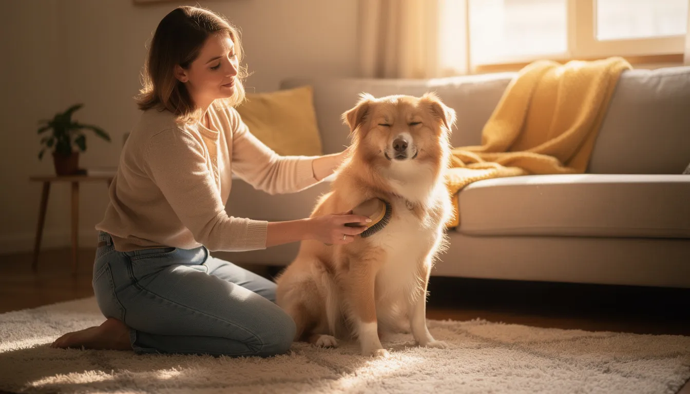Właściciel delikatnie czesze sierść psa, dbając o jego skórę i regularną pielęgnację, co jest istotne w zapobieganiu powstawaniu kaszaków. Pies wygląda na zrelaksowanego, a jego sierść jest lśniąca i zadbana.
