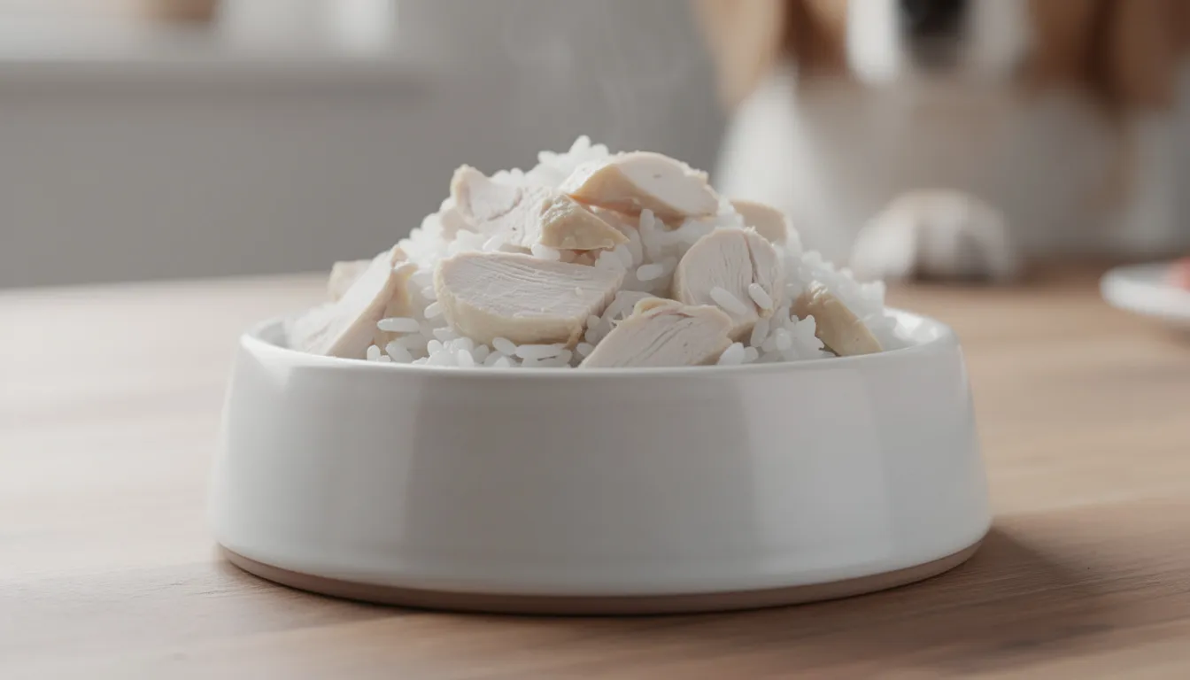 Na obrazku widoczna jest miska z lekkostrawną karmą dla psa, zawierająca ryż i gotowanego kurczaka. To zdrowy posiłek, który może pomóc w zapobieganiu problemom żołądkowym, takim jak wymioty u psa czy zapalenie żołądka.