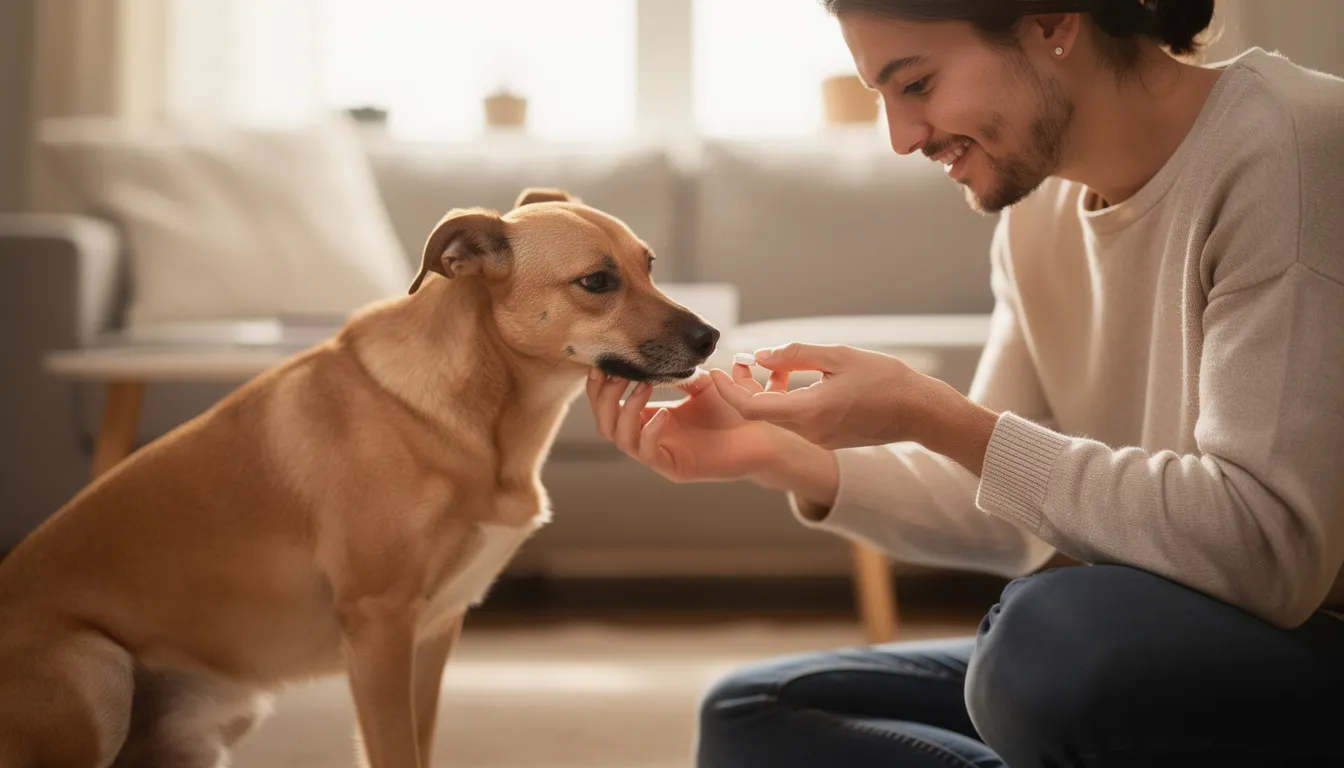 Na zdjęciu właściciel podaje psu tabletkę, co wskazuje na regularne odrobaczanie psa w celu zapobiegania pasożytom wewnętrznym. W tle widoczna jest troska o zdrowie zwierzaka, co jest ważne dla funkcjonowania organizmu czworonoga.
